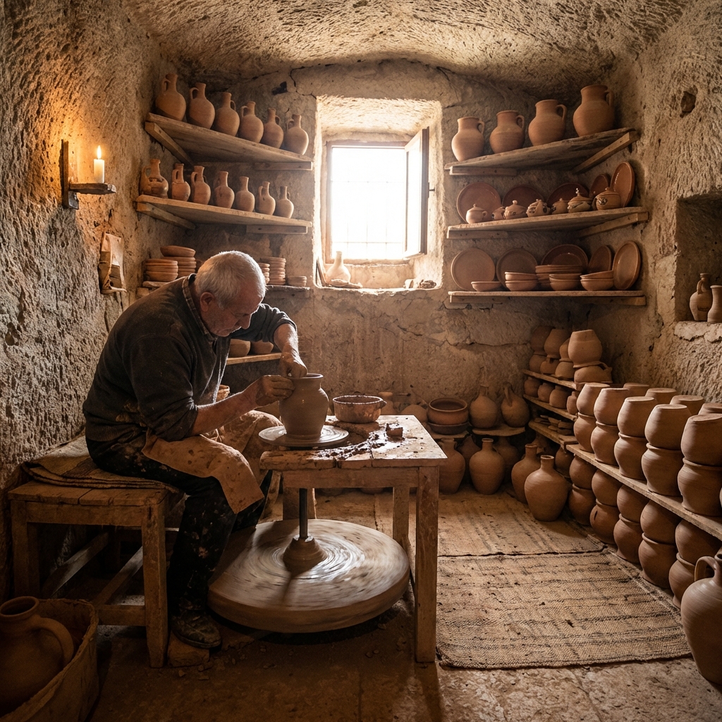 You sit around a master potter. He spins the kick-wheel (foot-powered) and transforms a lump of mud into a perfect wine jug in 60 seconds. It's mesmerizing. This part is usually free.